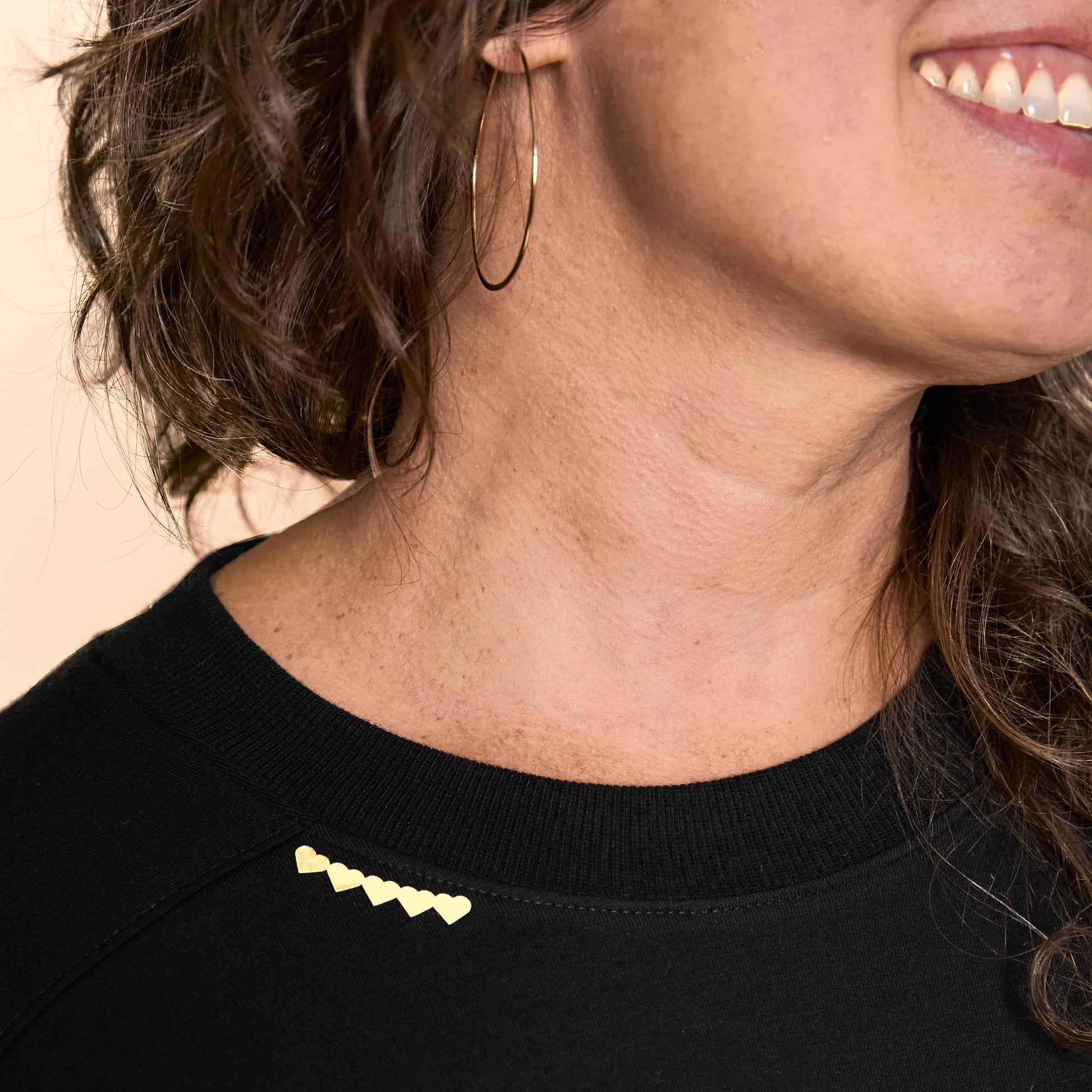 Express a message of love and kindness with the five discrete gold hearts around the neck and Mindy’s be love messaging across the upper back.
